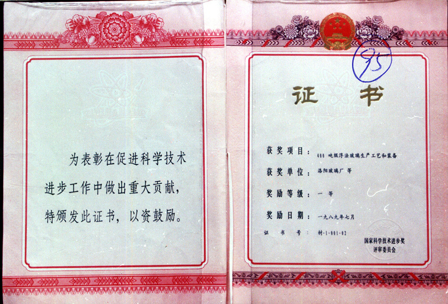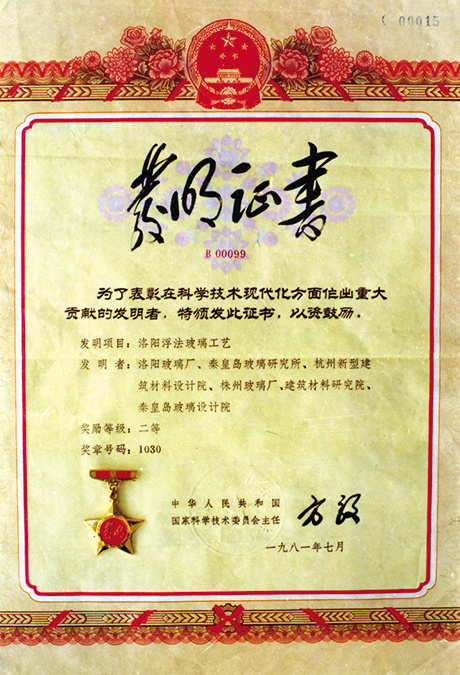 "洛阳浮法玻璃工艺" 发明证书