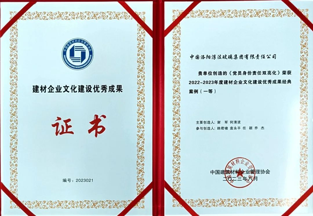 为深入贯彻落实习近平新时代中国特色社会主义思想,认真学习党的二十大精神,积极践行社会主义核心价值观,推进文化自信自强,挖掘、培育我国建材企业文化建设典型,引领和推进建材行业高质量发展,努力实现“宜业尚品、造福人类”建材行业发展新目标,中国建筑材料企业管理协会持续组织开展了年度建材企业文化建设优秀成果(案例)评选发布活动,洛玻集团党委推选的中国建材集团优秀党建品牌《党员身份责任双亮化》荣获“2022~2023”年度建材企业文化建设优秀成果经典案例(一等)。